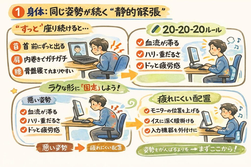 この疲れ、根性や気合いの問題ではありません。多くの場合、①同じ姿勢が続く、②画面を見続ける、③オンオフの境界が消えるという“在宅特有の条件”が重なって起きます。つまり、生活を大きく変えなくても、環境と休憩ルールを少し整えるだけで体感が変わる余地が大きいんです。