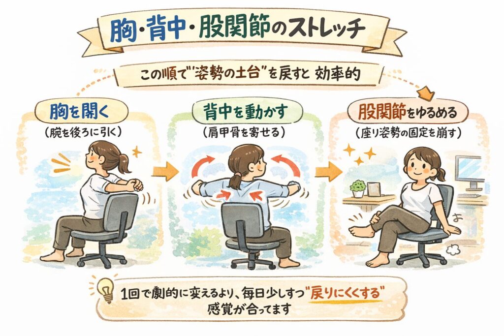 この順で“姿勢の土台”を戻すのが効率的です。1回で劇的に変えるより、毎日少しずつ「戻りにくくする」感覚が合っています。