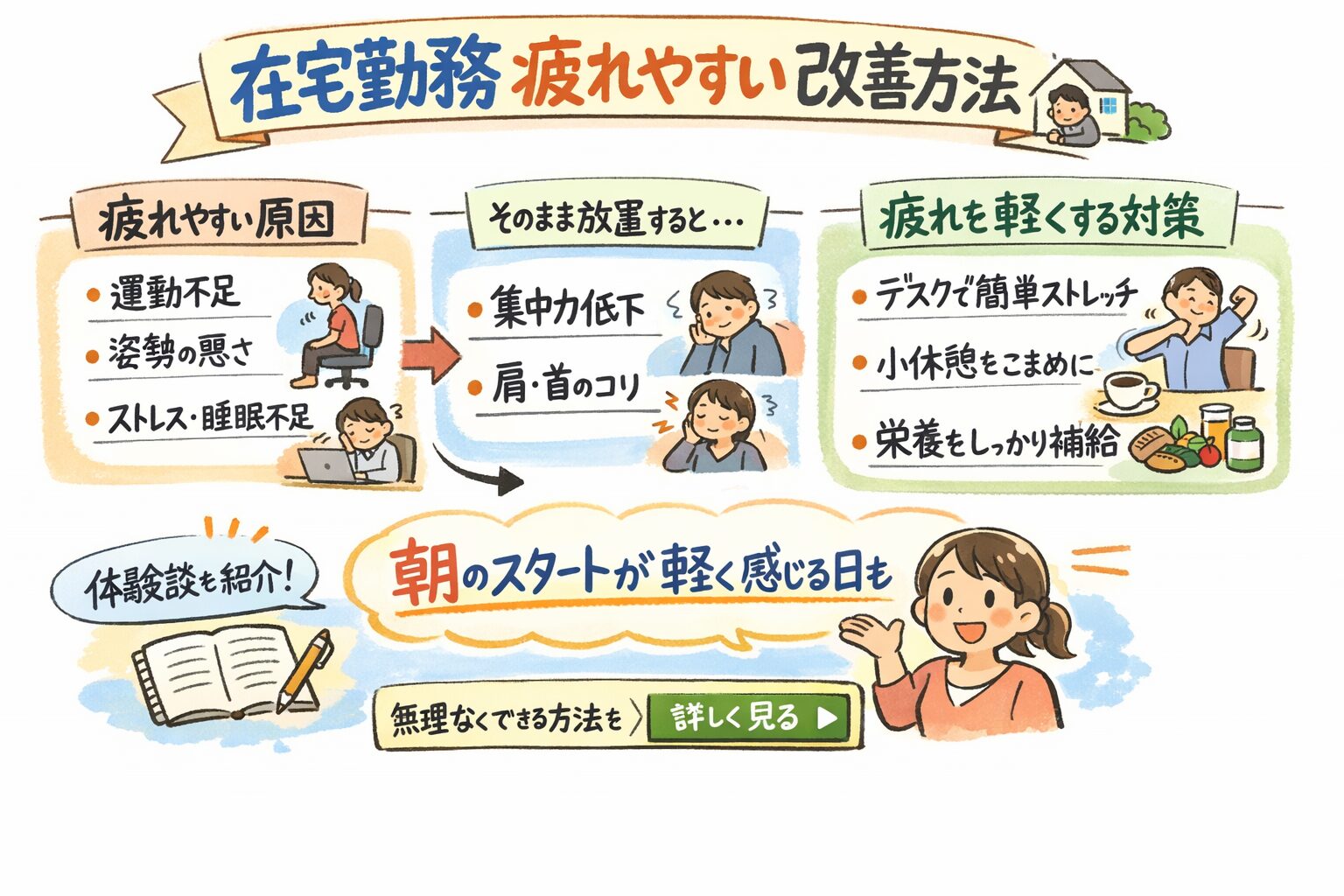 「1時間に1回、1分動く」からでOKです。上位記事でもストレッチや歩行など“低ハードル”が提案されています 。大きな運動を週1で頑張るより、小さな動きを毎日積む方が、在宅の疲れ対策としては続きやすいです。