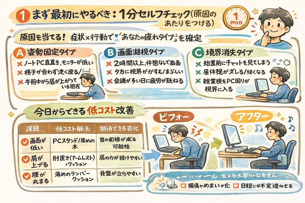 なので改善は、筋トレより先に、まず机・椅子・モニターの位置を「ラクな形に固定する」ことから始めるのが近道です。