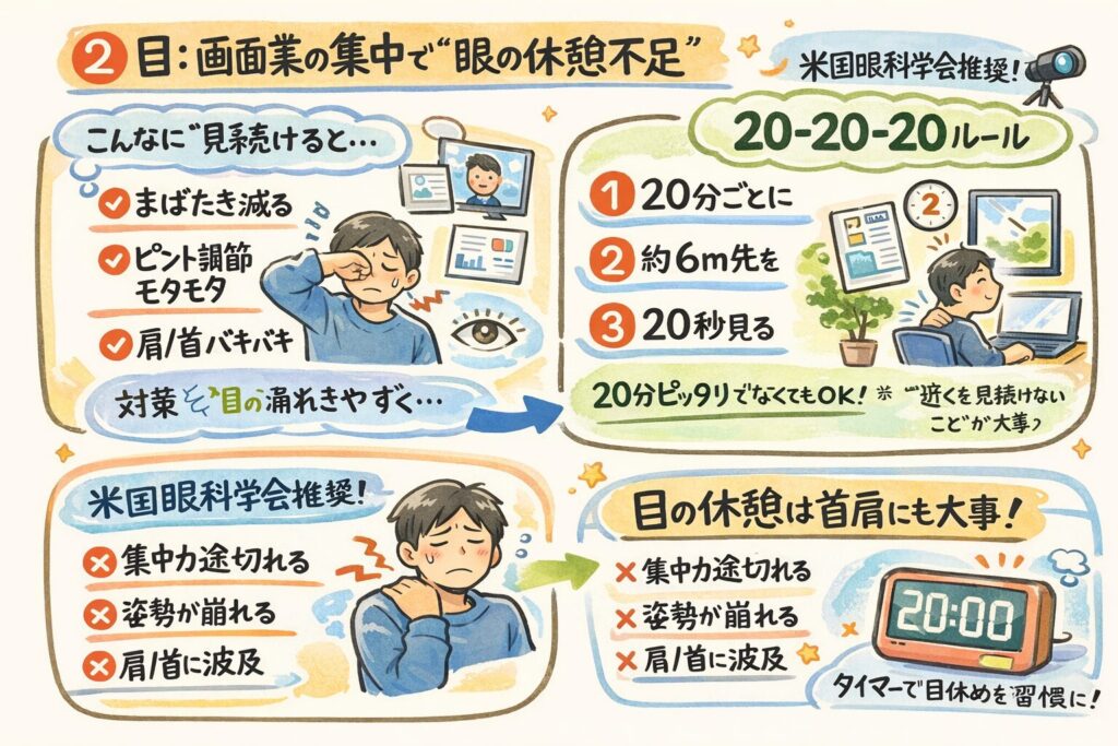 まずは「近くを見続けない」ルール化が効率的です。20分ごとに遠くを20秒見る20-20-20ルールが紹介されています 。次に、画面の高さ・眩しさ(グレア)・照明の整備も合わせると、目の負担が下がりやすいです 。