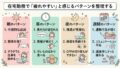 照明やグレア対策もチェックリストに含まれているので 、意外と“照明だけ”で楽になる人もいます。まずは「画面の高さ」と「肘の置き場」だけでも固定して、体感を見てください。