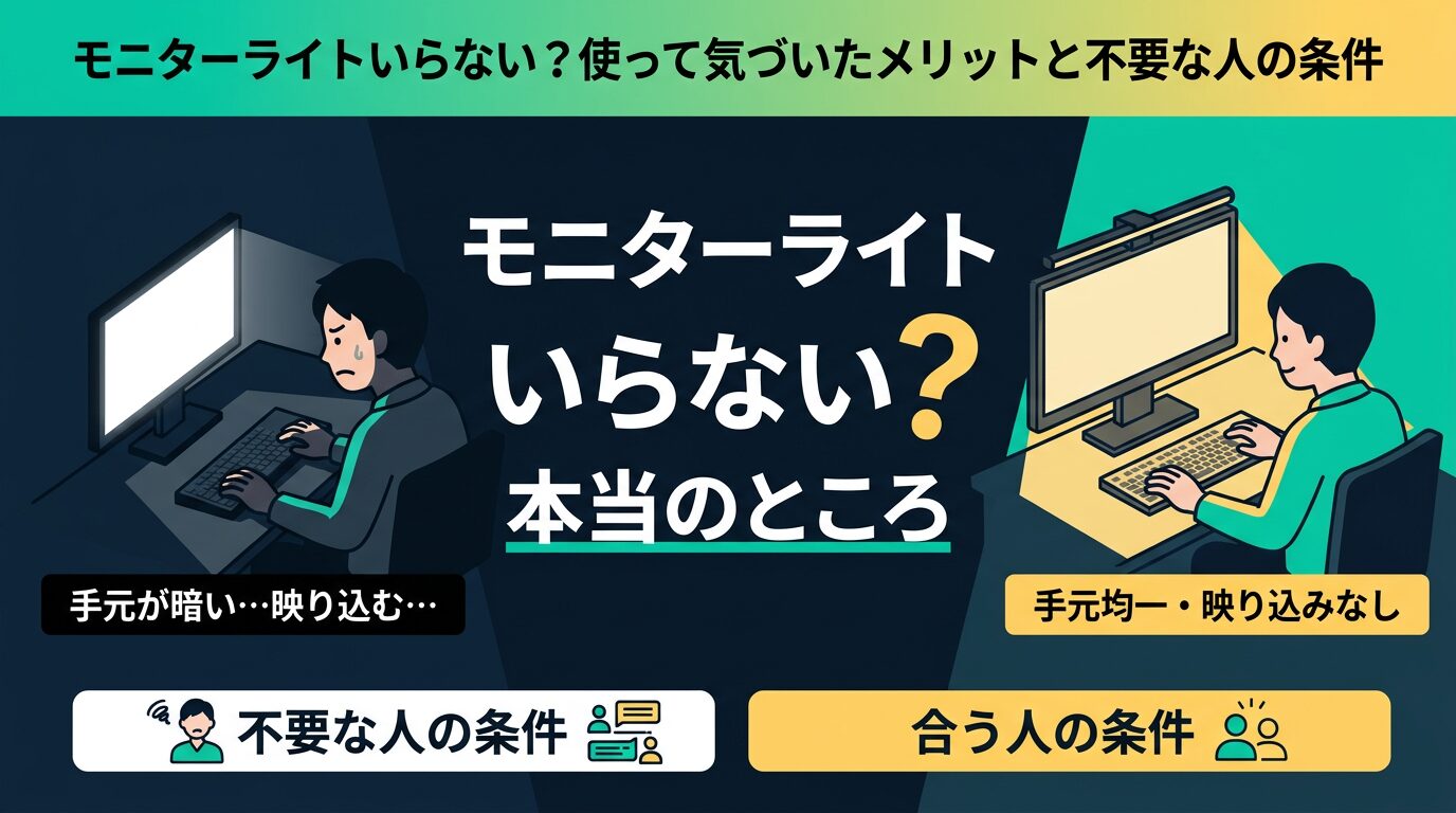 この記事では、モニターライトが不要と言われる理由を整理したうえで、実際に効果を感じやすい条件と、本当に不要なケースを具体的に解説する。購入前の判断材料として使ってほしい。