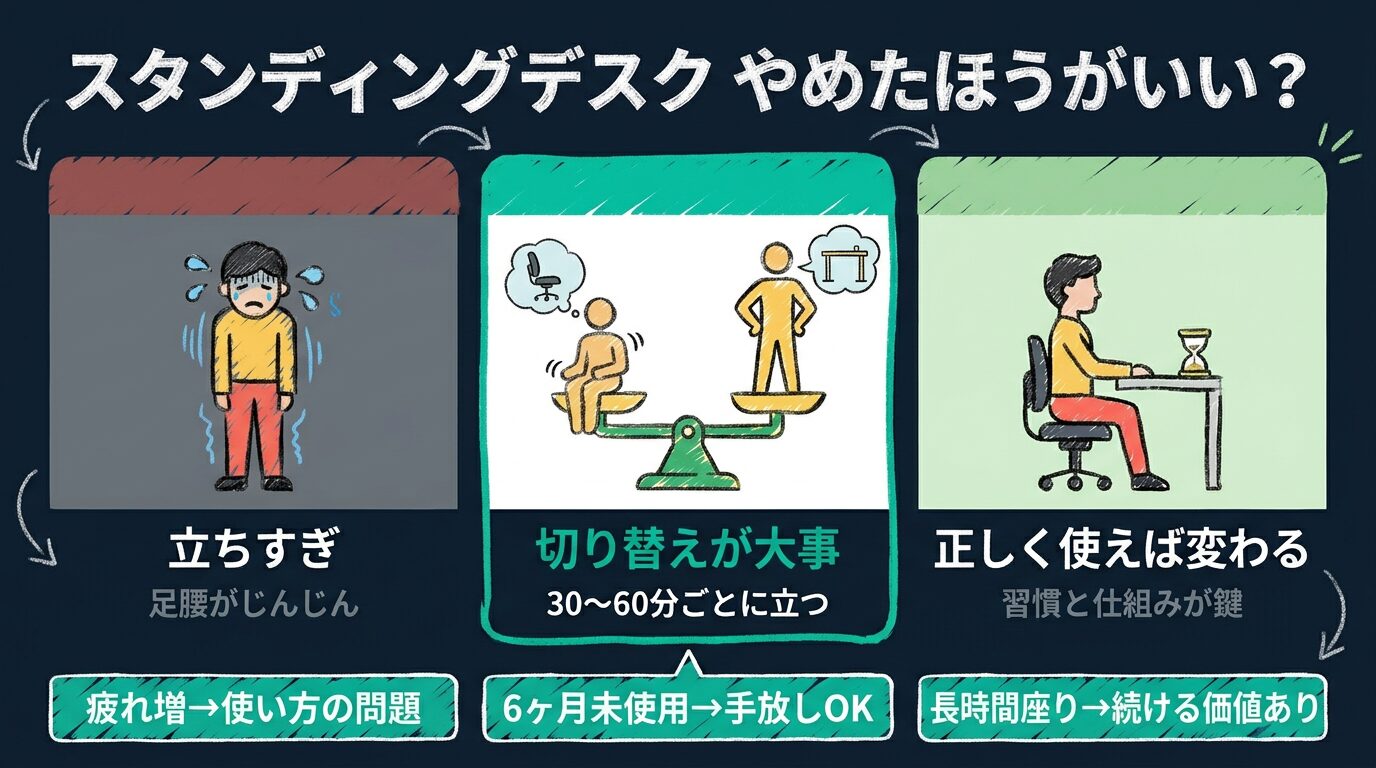 A. 「やめた方がいい」かどうかは使い方と目的次第です。立ちっぱなしで疲れが増しているなら、まず使い方を見直すことが先です。「30〜60分ごとに10〜15分立つ」というリズムに変えるだけで体感が変わることがあります。一方で、6ヶ月以上所有しているが昇降機能を週1回も使っていないという状況なら、スペースや費用を別の環境改善に充てることも現実的な選択肢です。「やめるかどうか」を考える前に、「正しく使えているか」を確認することをおすすめします。