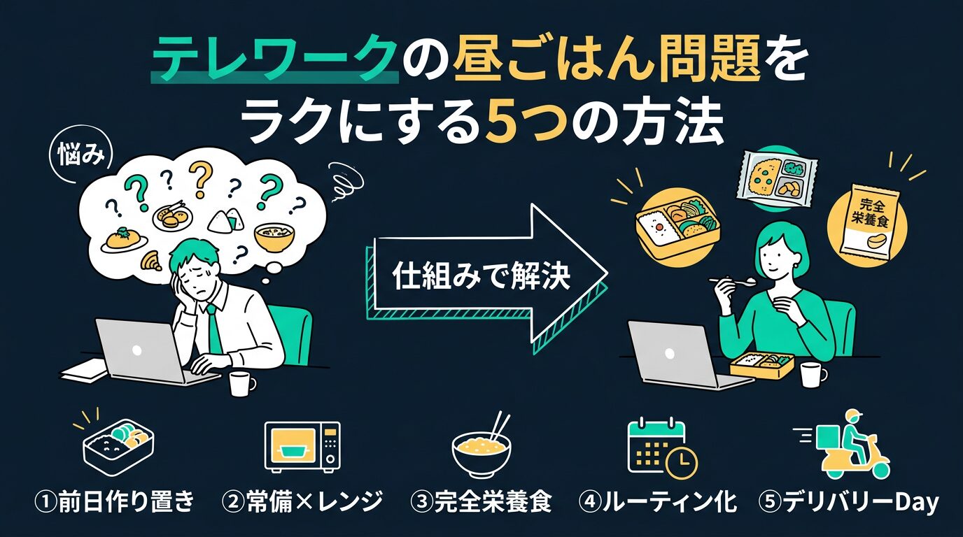 この記事では、テレワークの昼ごはんがめんどくさくなる構造的な理由を整理したうえで、今日からすぐに使える5つの解決策を具体的に紹介します。完璧な昼食でなくていい。今より少しだけラクになれば、午後の仕事も変わります。